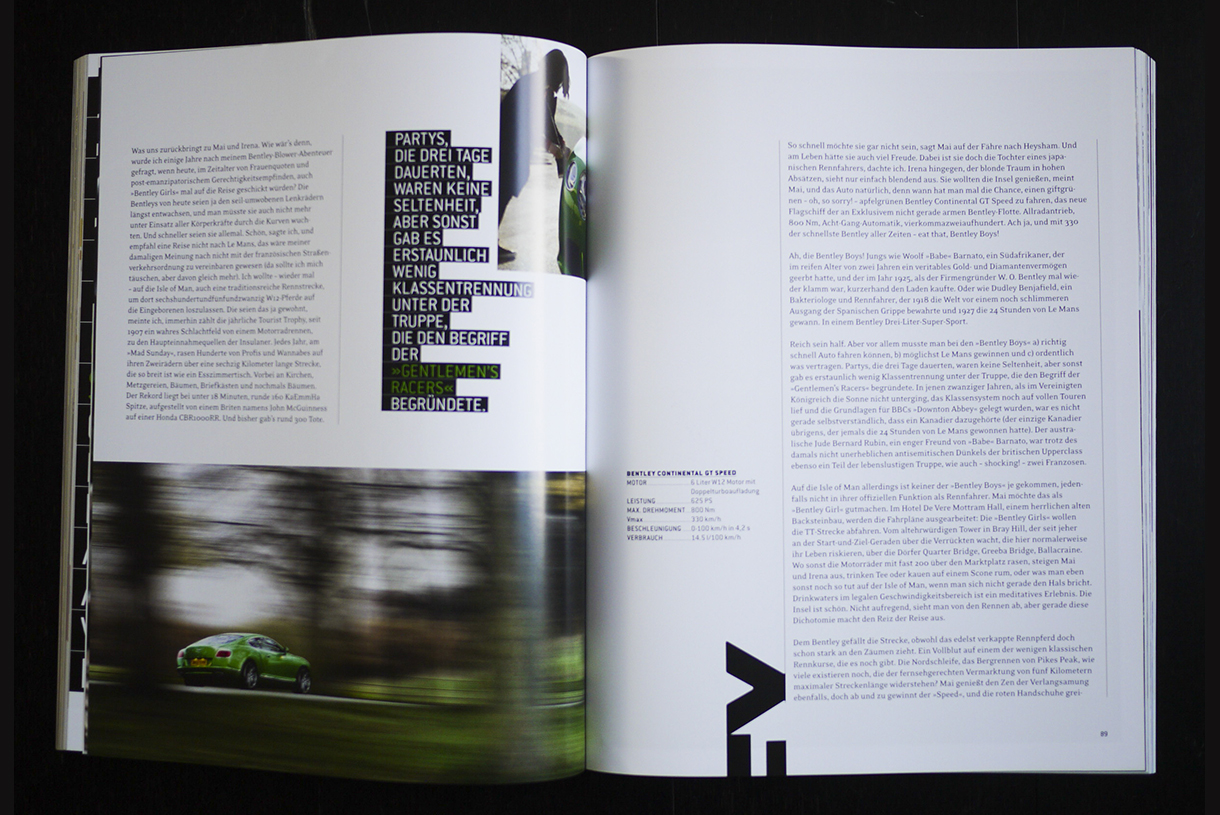 Bentley Motors asks our Creative Director Mai Ikuzawa to challenge the Isle of Man TT Circuit in a Bentley Continental GT Speed. Read the special 14-page report in the stunning Ramp Magazine, Germany.